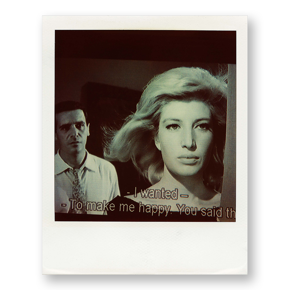 Like a photojournalist capturing life as it unfolds, Arthur Belebeau photographed this moment as it flickered across his screen. Two actors face forward, one trying not to lose the other. The only polaroid of this series with subtitles, reading: “I wanted… To make me happy you said th”, a sentence cut short, suspended mid-thought. Even incomplete, the line holds weight. It is a quiet tension Arthur knows well, the space between connection and distance, intention and image. These early experiments echo through Belebeau’s later editorial work.